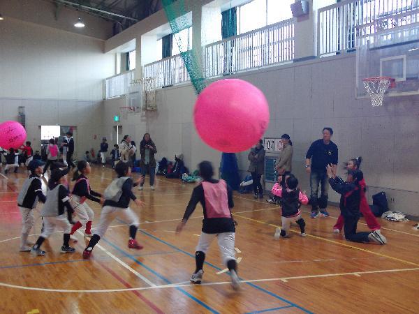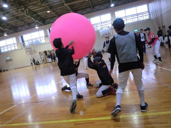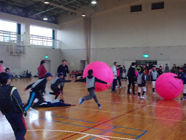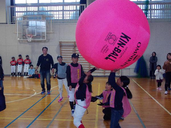 キンボールは4人1チームで力を合わせてチャレンジしました。